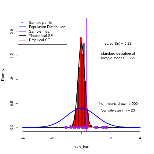 legend("topleft",legend=c('Sample points','Population Distribution','Sample mean','Theoretical SE','Empirical SE'),