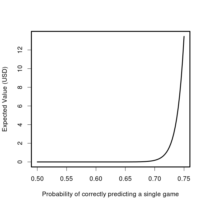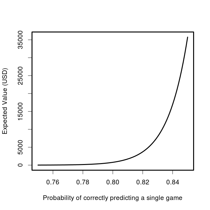 Just as we saw that the expected value is very sensitive to the predictive accuracy of the participant, so too is the probability that the prize will be awarded at all. If 1 million super talented sporting sages with 80% game-level accuracy enter the contest, there will only be a slightly greater than 50% chance of anyone actually winning. If we substitute in a more reasonable (but let’s face it, still wildly high) figure for participants’ accuracy of 70%, the chance becomes only 1 in 5739 (0.017%) that the top prize will even be awarded even with a 1 million strong entrant pool.