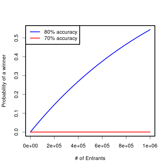 Those are the odds for an individual entrant, but what are the chances that Buffet and co will have to pay out? That, of course, depends on the number of entrants. Lets assume that the skill of all entrants is the same, though they all have unique models which make different predictions. In this case we can get the probability of at least one of them hitting it big. It will be the complement of no one winning. We already know the odds for a single entrant with a given level of accuracy, so we can just take the probability that each one doesn’t win, then take 1 minus that value.