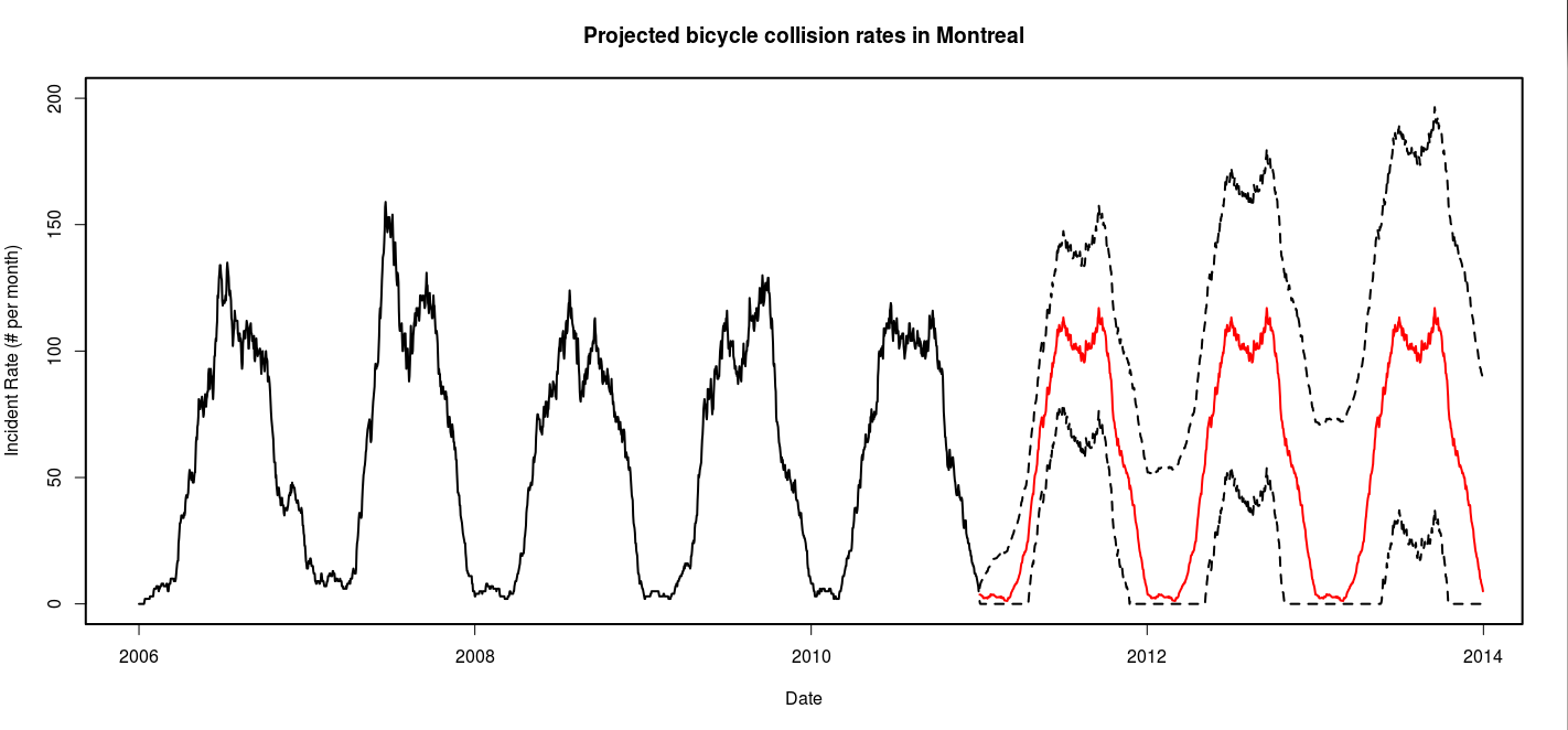 About a year ago I posted this video visualization of all the reported accidents involving bicycles in Montreal between 2006 and 2010. In the process I also calculated and plotted the accident rate using a monthly moving average. The results followed a pattern that was for the most part to be expected. The rate shoots up in the spring, and declines to only a handful during the winter months.