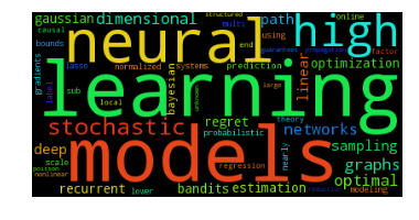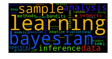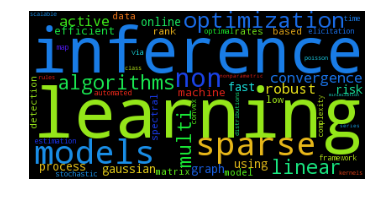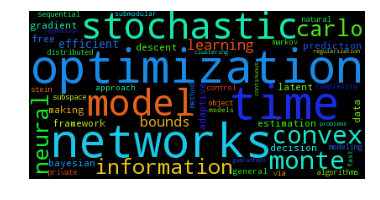 Building off of the great example code in a post by Jordan Barber on Latent Dirichlet Allocation (LDA) with Python, I scraped the paper titles and built an LDA topic model with 5 topics. All of the code to reproduce this post is available on github. Here are the top 10 most probable words from each of the derived topics: