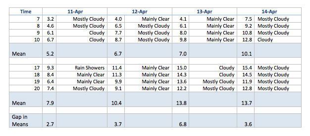 A few things jump out: 1) There are clearly defined peaks at both the morning and evening rush hours, but it looks like the evening rush is typically a little stronger. I guess cycling home is a great way to relax after a day at work. 2) The data collector seems to have gone offline in the night on April 18th. 3) Related to the first point, weekdays and weekends have distinct signatures. In fact, you can see a clear signal of Easter Monday, in that it looks like a weekend day. (click to enlarge)